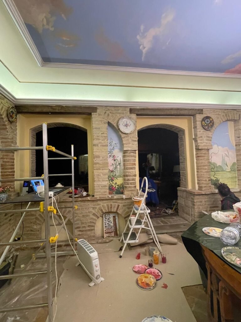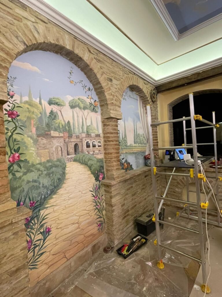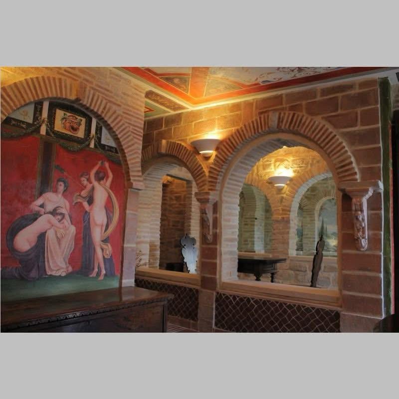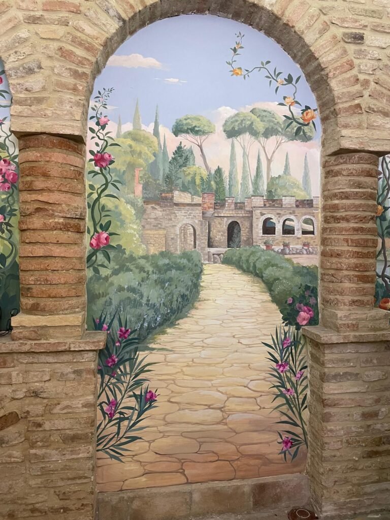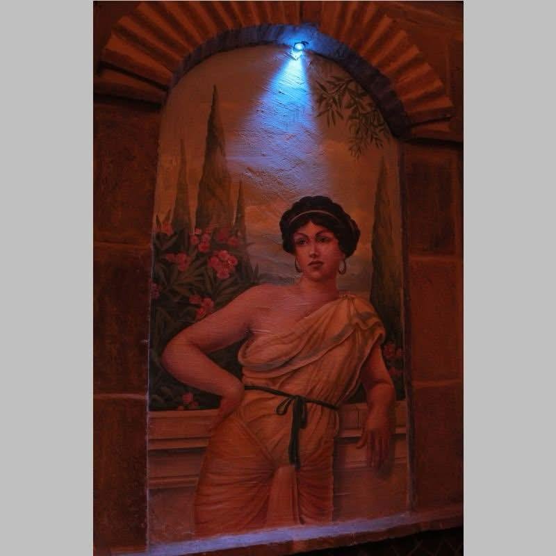We created Pompeian-style murals to bring warmth, depth and a historical atmosphere into the space, transforming it into a fully immersive environment.