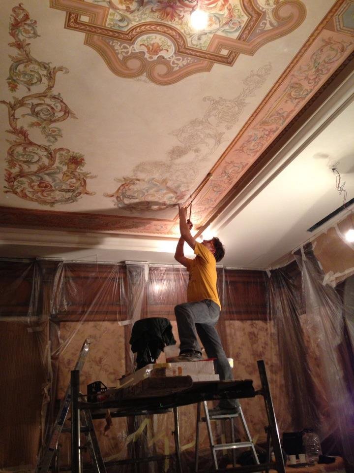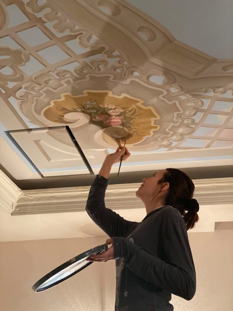 Her artistic path was shaped by formative experiences in Italy and years of atelier practice in furniture painting, restoration and surface refinement. Today, her work creates dialogue between tradition and innovation, integrating classical painterly language into architectural and immersive contexts.